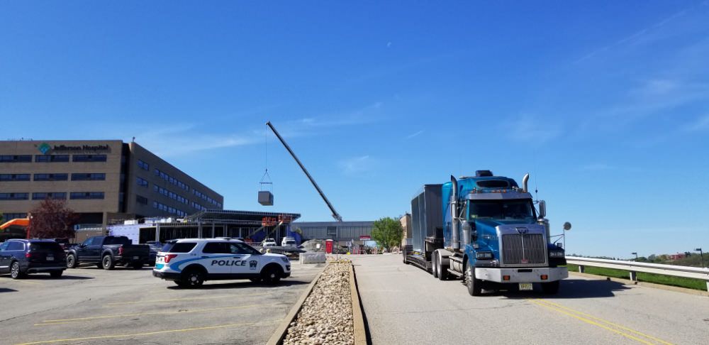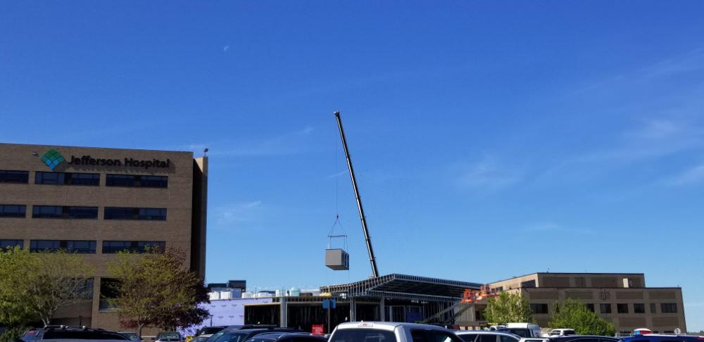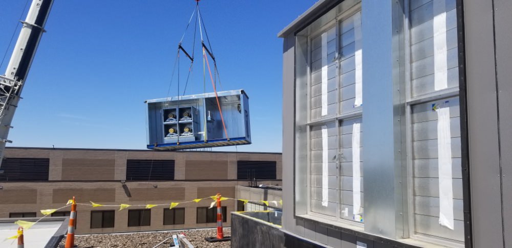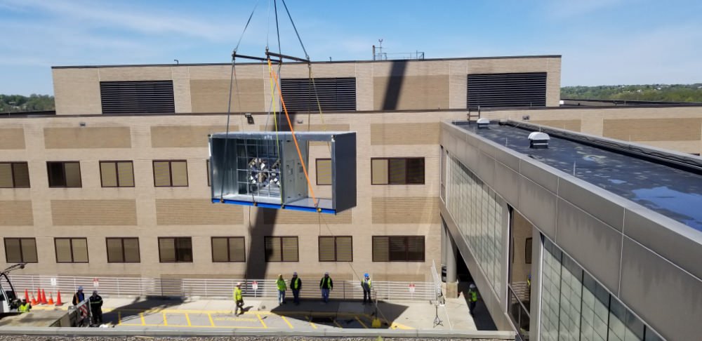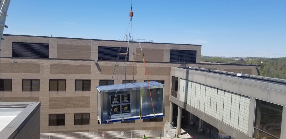 A 42,500 CFM hospital-grade AHU matching the architectural building siding.